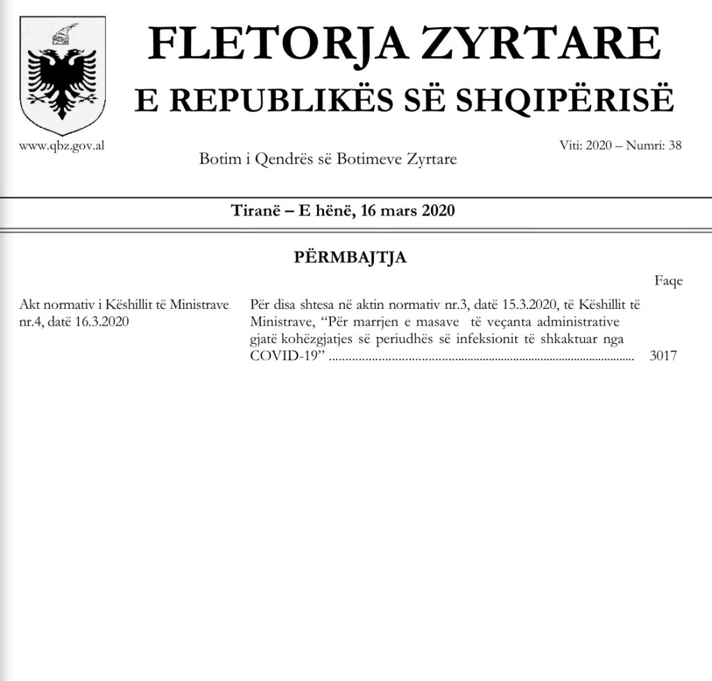 - Akt normativ Nr 4 datë 16.3.2020, F.Z 38 “Pë r disa shtesa në aktin normativ nr.3, datë 15.3.2020, t ë Këshillit të Ministrave, “Për marrjen e masave të veçanta administrative gjatë kohëzgjatjes së periudhës së infeksionit të shkaktuar ngaCOVID-19”